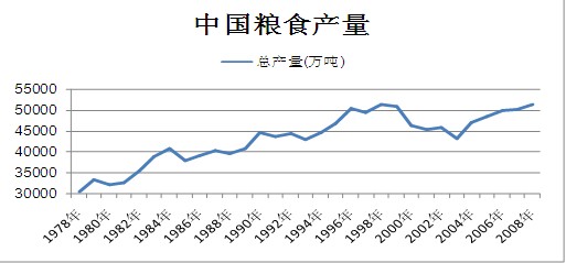图2中国粮食产量(注:2008年产量为预测值) 粮食是人类生存最基本的生活消费品,一个国家的粮食问题是关系到本国的国计民生的头等大事。我们知道,农业是国民经济发展的基础,粮食是基础的基础,因此粮食生产是关系到一个国家生存与发展的一个永恒的主题。建国以来我