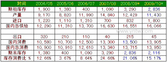 本期平衡表下调2009/10年度的食糖国内消费量预期,由1417万吨下调为1350万吨,本年度的期末库存预期由208.7万吨上调为283.6万吨。