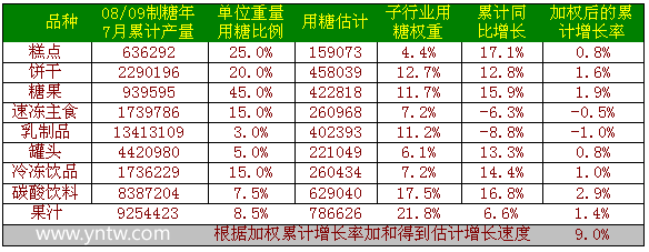 消费方面,依据统计局发布的7月份食品工业统计数据,各含糖食品生产形势良好,我们经计算预计本制糖年的工业食糖消费同比增长速度将在9%左右,目前我国食糖的消费构成主要分为家庭民用消费和工业消费,二者所占的比例按40%和60%算,民用消费刚性较强,可视为不变,那么按照上一制糖年度消费食糖1330万吨计算,本年度的食糖消费需求将达到1402万吨,比上一次预测下调15万吨。再考虑到糖价高企可能会令淀粉糖作为替代品挤占食糖的消费空间,参考05、06年时糖价高涨的情形,预计淀粉糖将至少抢占50万吨的消费空间,因此我们将本年度食糖的需求预期最终下调为1350万吨。