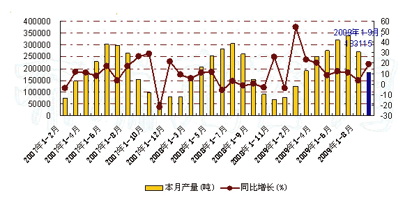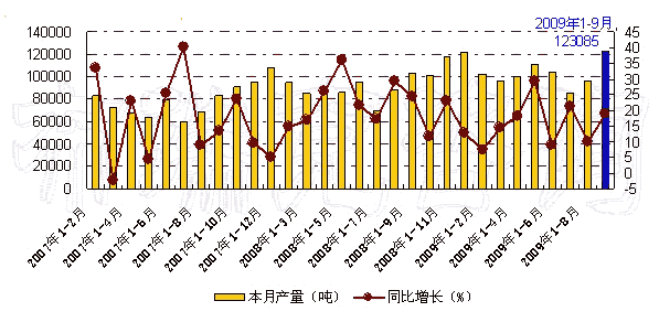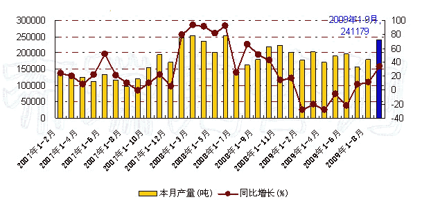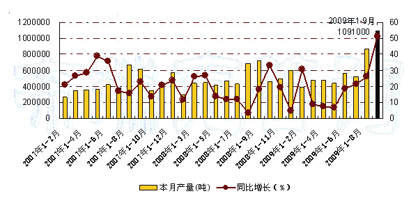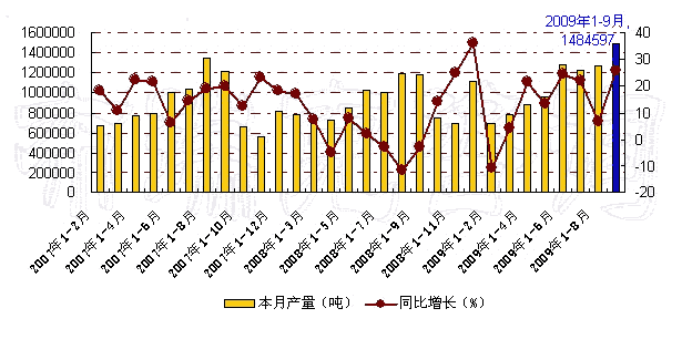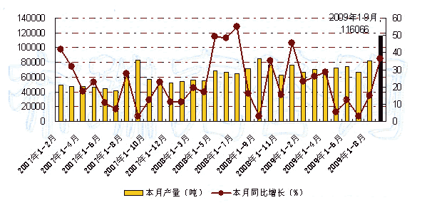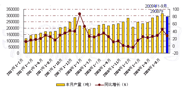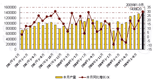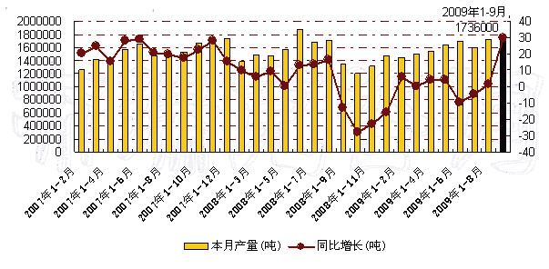 图 2007年-2009年9月我国果汁及蔬菜汁饮料月度产量