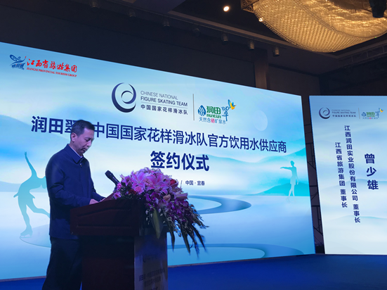 江西省旅游集团董事长兼江西润田实业股份有限公司董事长曾少雄也真挚地进行了发言。他承诺,未来将以最优质的润田翠天然含硒矿泉水为中国国家花样滑冰队的运动健儿提供日常生活、训练饮用水,同时也为中国国家花样滑冰队的运动健儿备战2022年北京冬奥会,提供健康饮用水保障。