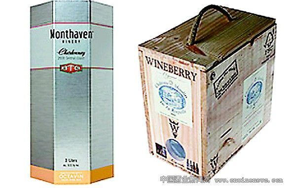 另外一种葡萄酒包装是木盒装。Wineberry America的Berry Boxes所采用的木盒是以可持续森林的木材精心制成,当葡萄酒喝完后,这些包装还可用作喂鸟容器或午餐盒。其产品产自法国波尔多、勃艮第、薄若莱和罗纳河谷等产区,于去年7月份在精品葡萄酒商店面市,售价为33美元—49美元,销售盛况令人吃惊。与传统的纸盒装相比,这种木盒带有可分解的塑料衬里,当葡萄酒倒出时,空气会被自动排出,防止氧化。