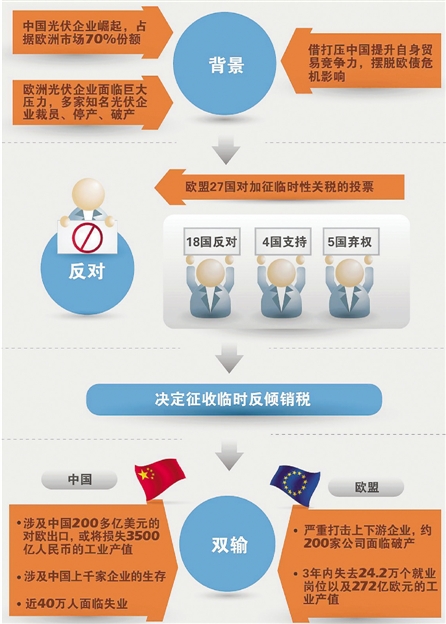 5月上旬,比利时籍的欧盟贸易首席代表即贸易专员卡洛·德古赫特向欧委会提交建议案,支持对中国输欧太阳能产品征收反倾销关税,在5月下旬的投票中,德国、英国、荷兰、瑞典等 18个国家投了反对票,而法国、意大利、葡萄牙、立陶宛四国投赞成票,另有波兰、西班牙、奥地利、罗马尼亚、拉脱维亚五国弃权。