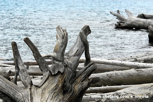 与路易斯湖隔山而邻的,其实同样精彩却有点冷门的, 是小家碧玉般的梦莲湖(Lake Moraine, 也有译作莫兰湖,都很梦幻, 都很古典而遥远。。。)。那天, 到的时候, 天有点阴沉。湖边的风更是大得有点意外,九月的“夏天”中竟然觉得有点冷, 不过,敢那是一种清新的刺激。 零落的古木, 冷清的小艇,在蓝色的微惊的湖的波光里, 给我一种风中的安静。于是, 低回的脚步, 匆匆的走过湖边的小径; 目光仰首,看千万年以来守护这一汪碧波的雪山十峰, 想像, 也许, 就可以这样地驰骋在白雪云巅之上...
