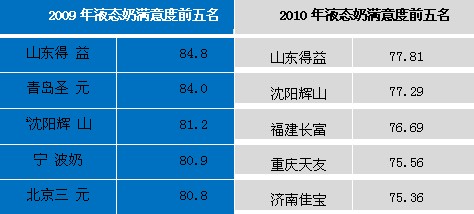 本次液态奶调查在北京、上海等22个大中城市共选取了27个品牌,区域巴氏牛奶品牌又一次战胜全国乳业巨头,测评结果显示,山东得益、沈阳辉山、福建长富、重庆天友、济南佳宝5个区域巴氏品牌位列消费者满意度前5位,其中第一名得益和第五名佳宝皆是山东乳业的领军品牌,而09年满意度前五分别是得益、圣元、辉山、宁波奶和三元的满意度得分均高于80分,其中第一名得益和第二名圣元也是山东乳业领军品牌。