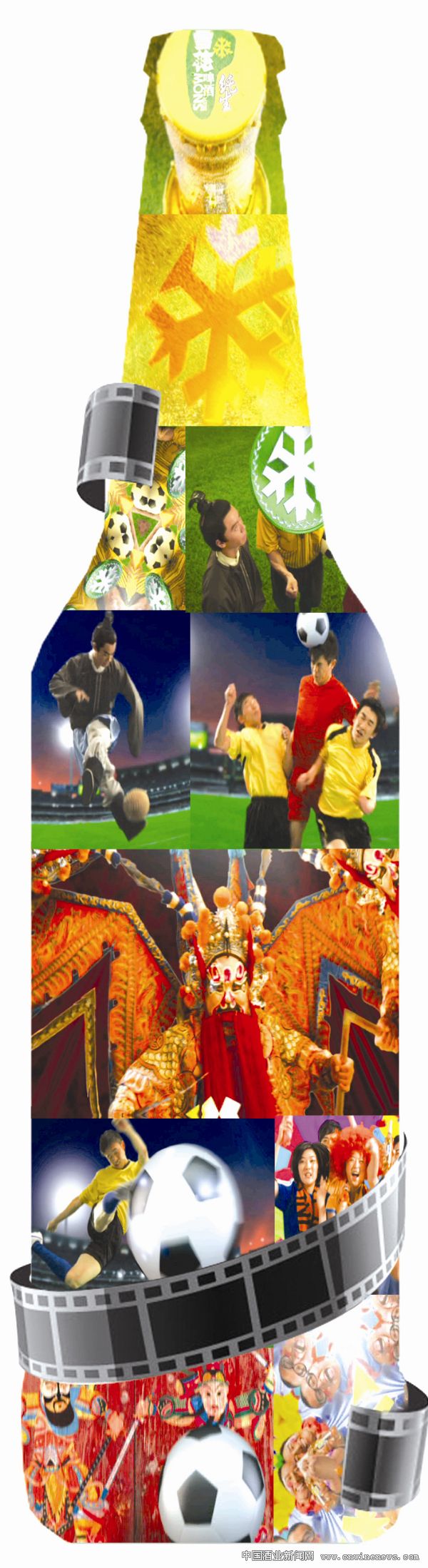 “世界最早的足球运动——蹴鞠运动员发球;经过万花筒镜头转换,时空切换到当代。当代足球运动员抢球、射门;又回古代,京剧人物在这激动人心的一幕,握紧手中兵器,为守门员捏了一把汗,最终中国门神将球挡出球门;现代观众为这精彩一幕欢呼。”这一幕如果不看其他元素,观者一定以为是世界杯组委会为突出足球发展历史,为中国观众量身制作的足球宣传片。实则不然,这是华润雪花啤酒世界杯期间制作的突出中国力量的广告片。从此开始,华润雪花全面穿上了体现中国个性的新装。