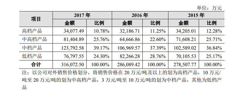受此影响,西凤酒陆续推出了红西凤、凤香经典、旗帜西凤等多款产品,尤其是定位高端的旗帜西凤被寄予厚望,被视为西凤酒的重要战略产品。尽管在招股说明书中,并未披露旗帜西凤的具体业绩,但是以其公布的产品构成档次的销售业绩来看,作为西凤酒产品体系塔尖的高档产品系列,2017年收入为3.41亿元,占比仅为10.78%。占比较大的是中高档和中档产品,分别25.76%和39.17%。