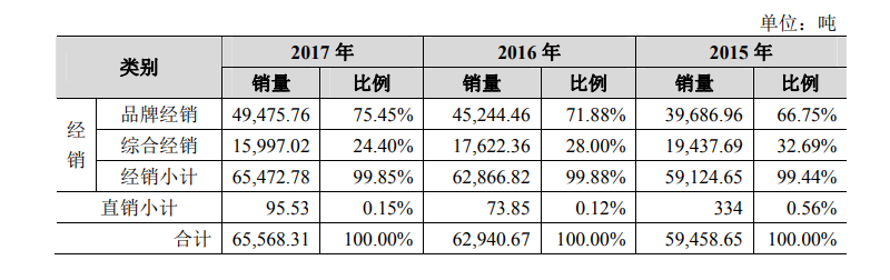 据了解,西凤酒品牌经销产品包括华山论剑、国花瓷以及“收编”前的西凤六年和十五年。据西凤酒的招股说明书显示,西凤酒品牌经销渠道销量的占比在2015年、2016年、2017年分别为66.75%、71.88%和75.45%,比重非常高。