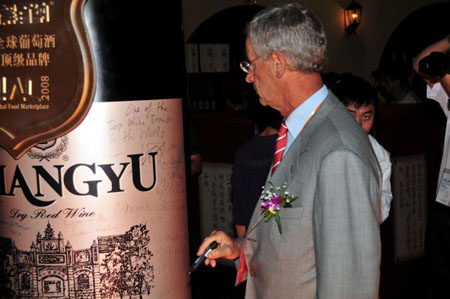 国际葡萄与葡萄酒组织(OIV)主席Yves Benard先生参观了张裕解百纳大酒瓶,并欣然在其上题词:“One of the top wine brands in the world(世界顶级葡萄酒品牌之一)”。据悉,张裕解百纳去年被法国国际食品和饮料博览会(SIAL)评为“全球葡萄酒30个顶级品牌”,Benard先生正好担任SIAL评委会主席。Benard先生在谈及张裕解百纳为何获评时表示:“我们知道,张裕解百纳是一个拥有悠久历史与强大实力的品牌。重要的是,并非我一个人,而是所有评委都认为这款酒的质量非常优秀。”
