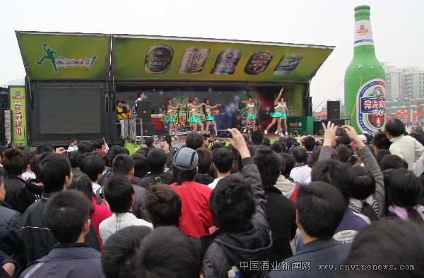 为了在赛场外的比赛中占得先机,青啤可以说下足了工夫。早在1个月前,青啤就开始在餐饮、商超渠道布置马拉松宣传,开展促销活动。在比赛当天,以“激情一灌到底”为大门的“绿色部落”的成为人气最旺的品牌展示区。青啤还邀请了今年红遍全国、刚刚从美国NBA赛场归来的青岛啤酒“炫舞激情”NBA啦啦宝贝,到场为比赛鼓劲助威,引来了周围围观群众的驻足观看,成为赛场之外最迷人的风景线。激情反射、无动力投篮、激情高尔夫、激情碰撞等小游戏吸引了数万计的运动爱好者参与。而“百年青啤文化展示”能让人在观看舞台表演的同时,感受百年社会变迁中青啤基业常青的魅力。