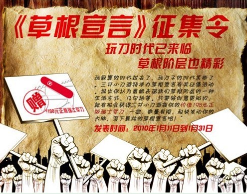 活动主要以留言的方式在博客、新闻和帖子中征集,网友们只要搜索“张国强三井小刀新浪博客”即可参与。可以写下自己认为最能代表草根文化的话语,随后评选出最佳的十条草根宣言,作者可以获得精美的瑞士军刀一把。张国强也希望默默无闻的草根阶层能站起来,能认识到自己身体中蕴含的强大能量,让全世界都认识到我们草根的力量。