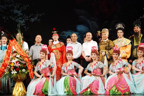 今天,应湖北省文化厅和朝鲜《红楼梦》剧领团团长吴英植邀请,湖北古隆中演义酒业有限公司董事长兼总经理邹远东从襄樊赶到武汉,观看朝鲜艺术家演中国名剧《红楼梦》的首场演出,朝鲜艺术家以朝鲜民族能歌善舞的艺术表现形式,绕着贾宝玉和林黛玉的爱情主线,栩栩如生地把中国古代名剧《红楼梦》表现得淋漓尽致,表现出朝鲜艺术家对中国《红楼梦》的文学领悟、艺术功底和造诣。演出结束后,湖北古隆中演义酒业有限公司董事长兼总经理邹远东陪同湖北省文化厅副厅长杨甫念以及有关方面负责人上台与朝鲜艺术家们一一握手,祝贺演出成功,并合影留念。