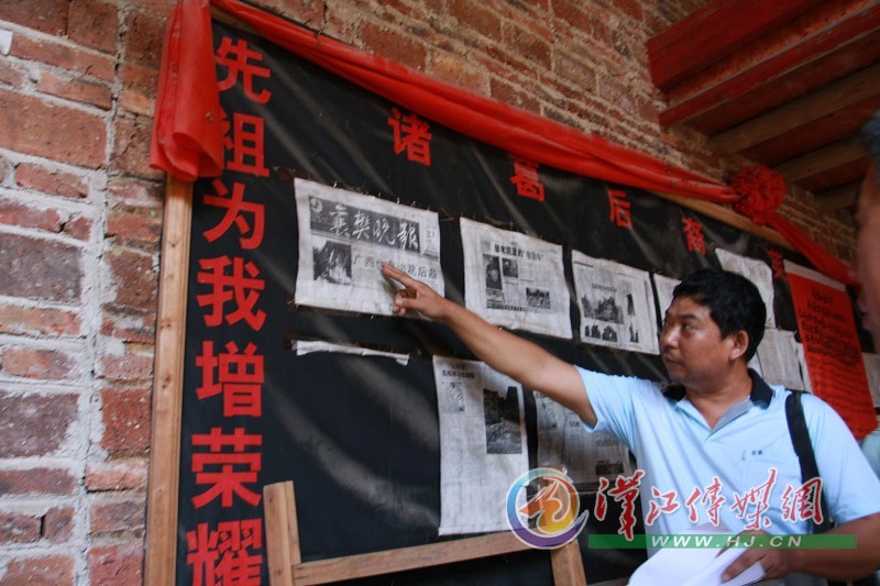 在翠屏村的诸葛氏祠堂内,记者看到,墙上悬挂着各地媒体对当地诸葛后裔的报道。墙上最显眼的位置上贴的是2002年3月23日的《襄樊晚报》的一篇文章《诸葛亮研究的新发现——广西也有诸葛后裔》。诸葛后裔诸葛有文指着这篇报道说,“襄樊已故的文史专家丁宝斋认定了我们的身份和来历,所以你们对我们来说,就是来自老家的客人。”(如图)