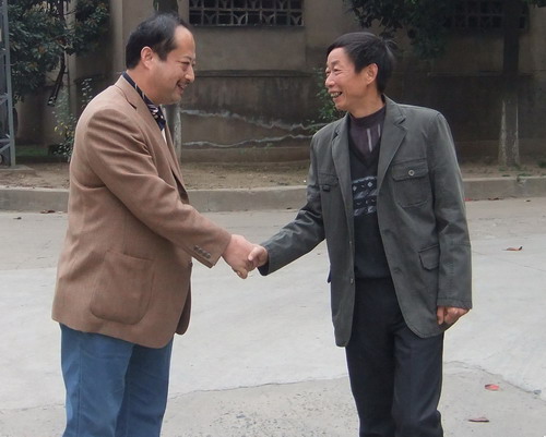 11月13日,保康县马良镇潮水村村委书记杨承谷(右)一行来到古隆中演义酒业,感谢公司为当地扶贫事业所作