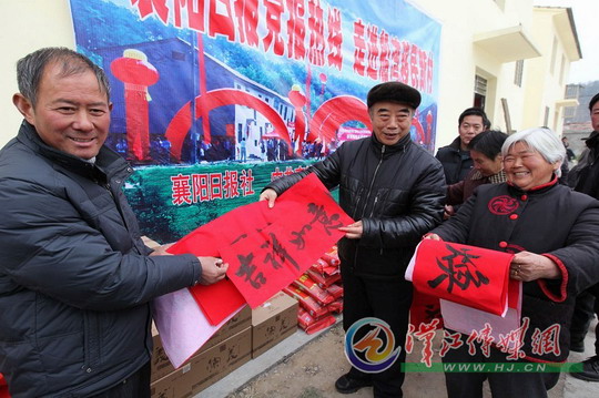 月14日,湖北古隆中演义酒业有限公司携手襄阳日报社、南漳县委宣传部,同时邀请了襄阳市书法家协会、市美术家协会、市老年书画协会10多名著名书画家,一起来到南漳县城关镇船湾移民新村,为移民发放过年物资,书写春联,给移民群众送来了一份特殊的“新年贺礼”。