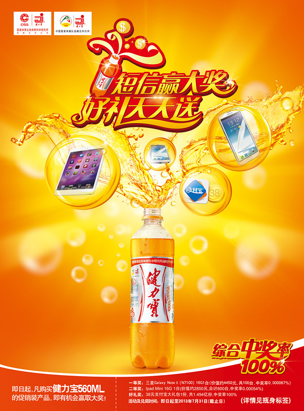 本次活动的开展,勾起无数消费者对童年的回忆,对青春的怀念。据悉,本次活动,是健力宝史无前例的一次大手笔促销活动。每天派送1台三星Galaxy noteⅡ、8台苹果Ipad mini ,更有1.49亿份38元支付宝大礼包赠与消费者,100%的中奖率极大地激起了消费者的参与热情。