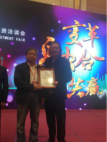 (五粮液股份福喜迎门酒喜获第十届中国糖酒食品业投融资洽谈会暨“2017年度糖酒食品业品牌与价值榜”2017年度优质产品奖,图为中国轻工企业投资发展协会理事长李国都先生为福喜迎门酒业颁奖,并与王葆森董事长于现场合影留念)