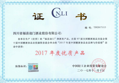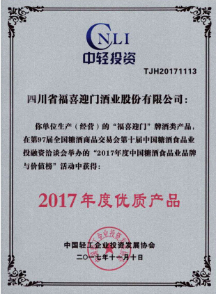 五粮液股份福喜迎门酒喜获2017年度优质产品奖