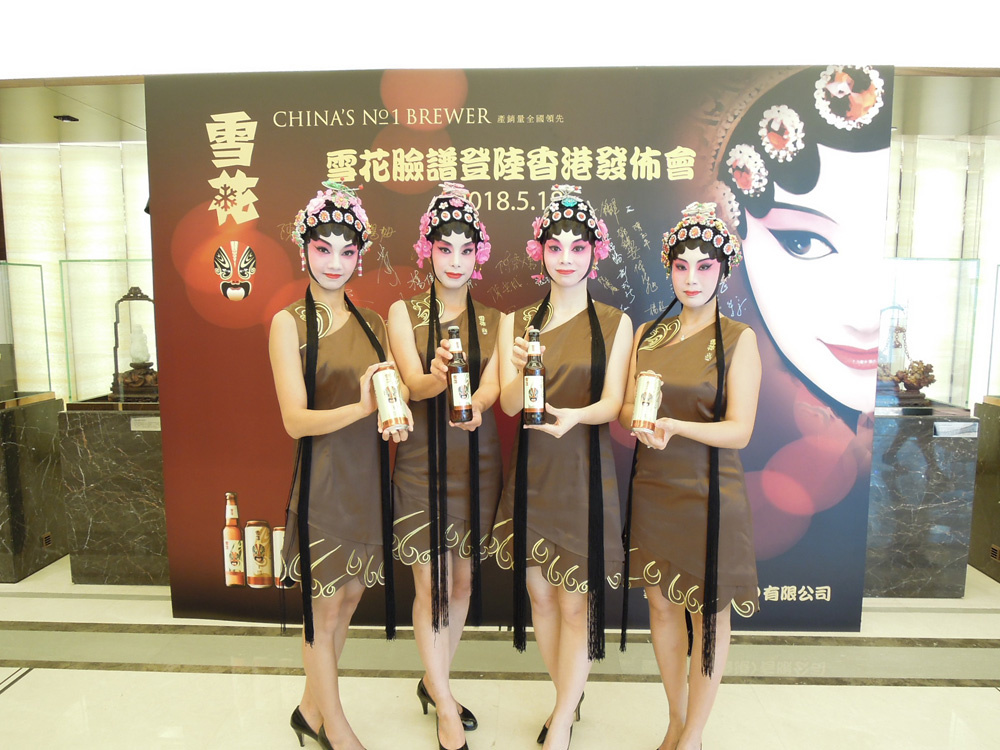 图:大会安排模特儿以花旦装扮示人,配合最新的雪花啤酒产品脸谱\ 大公报 摄 【大公报讯】每年第二、三季