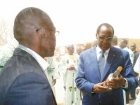 今年三月,布國總統龔保雷在布國農民日開幕典禮上,在高粱酒「SPIRIGHO」攤位前鑑賞把玩。 圖/我駐布吉納...