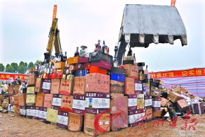 本报讯 (记者李少威)咆哮着的挖掘机,举着“重拳”砸向堆积如山的假酒,浓烈的酒味四处弥漫。6月11日,东莞市在大朗镇现场销毁2.7万瓶假冒伪劣酒品,价值达282万元。