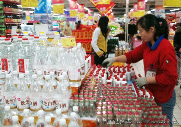 近日,记者在山东烟台家家悦、大润发、沃尔玛等大中型超市中看到,各超市都放置了一个酒水促销专柜,上面摆满了景芝、二锅头等品牌的低端白酒产品,产品的价位比平时低了很多,像景芝白酒1升装4.90元/瓶,高梁原浆4L装16.8元/桶,景芝烧锅酒4.5L装19.9元/桶,125ml的贵宾特供1.99元/瓶。据记者了解,像这样的货架上摆放的白酒目前都供不应求,特别是250ml、125ml的小瓶装二锅头、小地雷非常畅销。“很多酒水产品刚刚摆上不久就被拿走了,现在就剩下柜台上的这些了,还得去仓库再拿货。”超市的工作人员一边忙着摆货,一边对《华夏酒报》记者说。