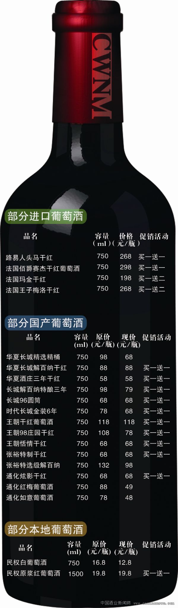 在进口葡萄酒旺销的同时,国产知名葡萄酒销售形势也出现了井喷之势,像张裕、长城、王朝等品牌葡萄酒,750ml装的葡萄酒市场标价在100元/瓶左右,春节临近,经销商不断加大促销力度,大部分经销商还制定了买一送一的优惠政策,实际售价在40元/瓶—50元/瓶。