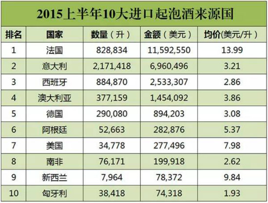 进口起泡酒总金额最多的依旧是法国,但其进口量远远低于意大利,这主要是因为产品不同造成的。法国的香槟拉高了价格,而意大利的主推起泡酒蓝布鲁斯科(Lambrusco)和普罗塞克(Prosseco)单价则比较低。
