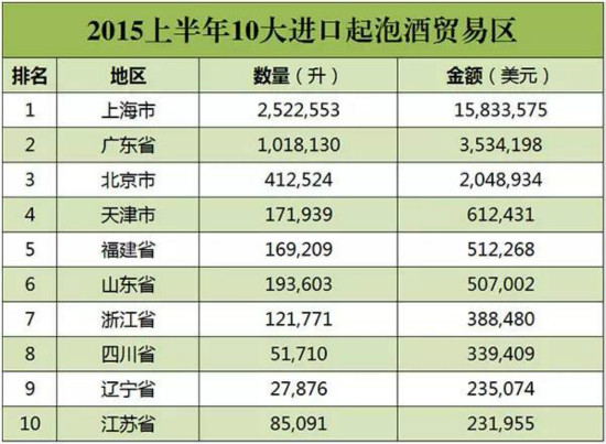 从贸易区域来看,上海市是绝对是全国起泡酒集散地,占了进口起泡酒一半以上的市场份额。(数据来源:海关信息网)