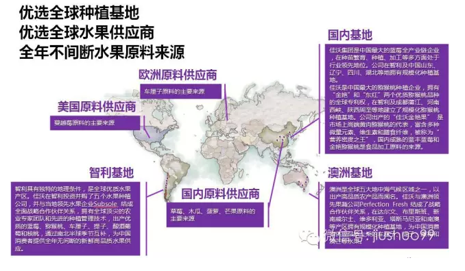 联想控股佳沃集团先后投资10亿大举进军农业与食品领域,为消费者提供安全、高品质的蓝莓系列产品,在国内陆续建立起规模化的蓝莓示范园,并拥有南美洲和澳大利亚的首批种植基地,其中包括在智利拥有5家水果种植公司,坚持发展蓝莓全产业链布局、蓝莓深加工,目前佳沃已经成为国内最大的蓝莓全产业链企业和最大的猕猴桃种植企业、蓝莓深加工行业领军企业。