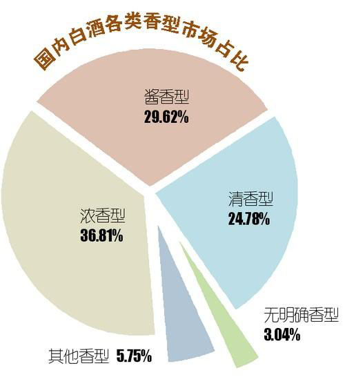那么哪种香型的酒卖得最好呢?销售人员表示,中国名酒中,泸州老窖特曲、剑南春、洋河大曲、古井贡酒、五粮液等都是浓香型白酒中的优秀代表;而酱香型又称为茅香型,以贵州茅台、四川郎酒为代表。中国酒业大数据平台显示,目前国内市场上,浓香型占比36.81%,酱香型占29.62%,清香型占24.78%,其他香型占5.75%,无明确香型占3.04%。