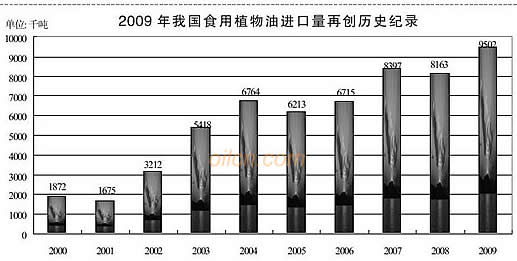 海关统计数据显示,2009年我国葵花籽油进口量达到15.3万吨,远远高于2008年的5668吨;此外,2009年我国还进口了2.1万吨花生油、1.4万吨橄榄油、1.3万吨亚麻籽油、1594吨芝麻油和1100吨玉米油。