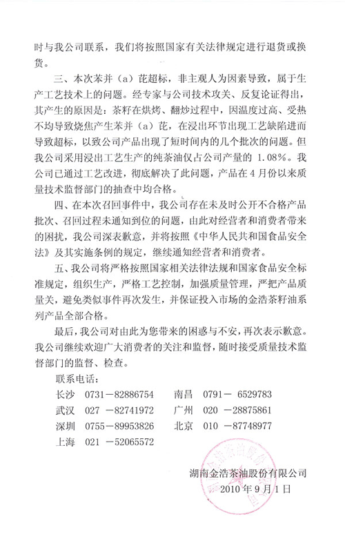 9月1日下午,湖南金浩茶油股份有限公司在其公司官方网站发表《致广大消费者致歉信》,承认该公司9个批次纯茶油产品存在苯并(a)芘超标问题,并于2010年3月20日进行过第一次全面召回。