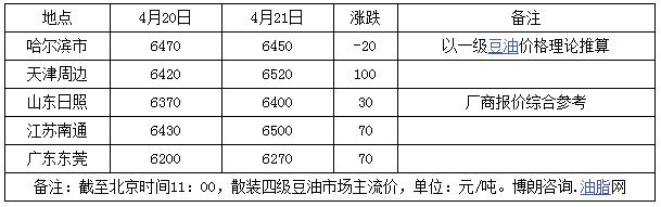 4月21日国内豆油价格继续上移