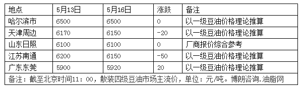 5月16日国内豆油现货价格整体偏弱