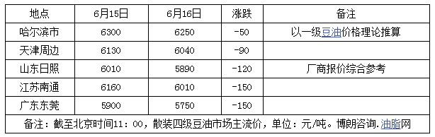 6月16日国内豆油现货价格整体继续下移,多数地区厂商报价随盘下调100-150元/吨不等,贸易商及终端需求主体