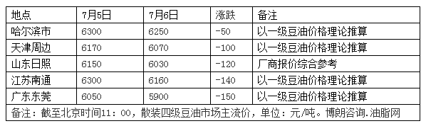 7月6日国内豆油现货价格整体下移,多数地区厂商报价随盘下调100-150元/吨不等,少数地区工厂停报观望。