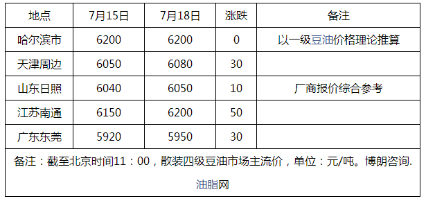 7月18日国内豆油现货价格稳中偏强调整,多数地区厂商报价随盘上调10-50元/吨不等,部分地区厂商继续稳价销
