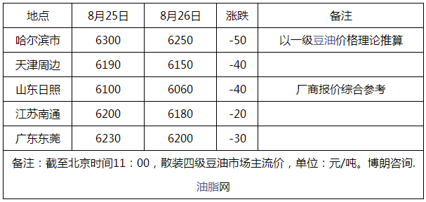 8月26日国内豆油现货价格整体偏弱调整,多数地区厂商报价随盘下调20-50元/吨不等,场内观望情绪浓郁,购销