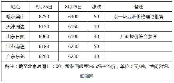 博朗咨询跟踪统计,国内散装一级豆油均价为6295元/吨,较上周五均价上涨36元/吨;散装四级豆油均价为6180元/吨,较上周五均价上涨32元/吨;进口毛豆油均价为6121元/吨,较上周五均价上涨33元/吨。
