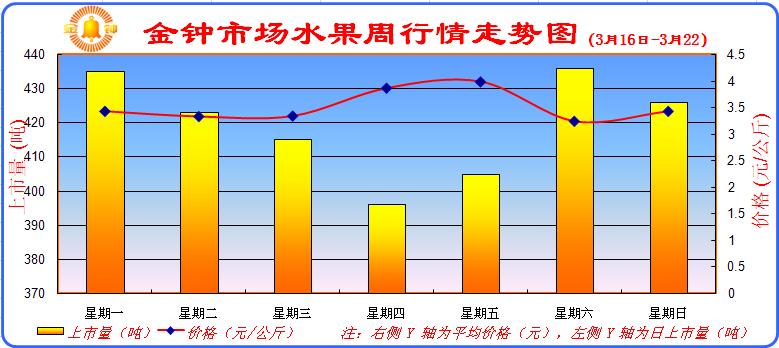 本周(2009年3月16日至2009年3月22日)我金钟批发市场对14水果品种进行了统计分析,本周水果的平均价格为3.51元,周环比上涨3%,与去年同比上涨7%,上市量为2936吨,周环比下降9%,与去年同比上涨1%。