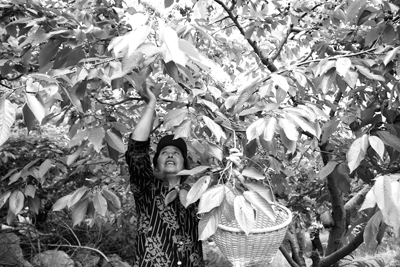 日前,四川汶川双河村羌族妇女依娜在标准化大樱桃田里告诉笔者,汶川灾后农业加快重建步伐,具有标准化品牌的“汶川甜樱桃”每斤单价为35元,倍受中外游客的青睐,她在田间地头就卖完了大樱桃。图为依娜在田头采摘标准化大樱桃。 董 勇 摄