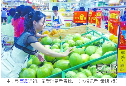 据介绍,以往7、8月份上市西瓜以大瓜为主(单瓜重在6公斤至10公斤以上),但今年,中、小型瓜全面主导市场。原因是大型瓜虽然价格略为便宜,但因西瓜从外观较难直观品质优劣,消费者选购大瓜心存顾虑,而且大瓜皮厚可食率较低。中、小瓜个体小,售卖方便,小家庭可一次性食用,即使买到劣质也损失较小。因此,中小型瓜适销,越来越受消费者青睐。
