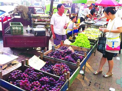 昨日,在兴隆路农贸市场,水果摊主李老板指着自己摊位前的货品说,这个品相的桃在一个月前能卖到7.5元/斤,现在才卖10元3斤。记者还发现,在早市上,价格最低的桃已经卖到了2元/斤。据兴隆路一家水果摊的摊主介绍,今年葡萄刚上市时的身价比去年要略低,一般在7.5元/斤至10元/斤,价格一直比较坚挺,直到最近几天上市量大了才开始下降,降幅在20%以上。此外,记者发现,目前西瓜已经降至最低8毛/斤,伏苹果、梨等水果的售价也多在3元/斤至5元/斤,其中西瓜的降幅最大,一个月前基本在1.5元/斤左右。
