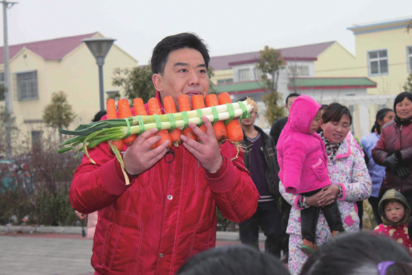这名中年男子叫南卫东,不仅嘴上正吹着红薯,旁边还放着胡萝卜、土豆、冬瓜、藕等各种各样的蔬菜,这些都是用来表演的。一曲结束,围观的村民掌声四起,纷纷叫绝。随后,南卫东再次用胡萝卜制成的排箫演奏了《上海滩》,用山药吹出了《雪绒花》,声音无不优美。“没想到平时吃的菜也能吹出歌,”村民听到演奏连称,“这人太有才了”。