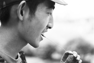 丁钰正在吃自己烤熟的蚱蜢。 张涵博 摄