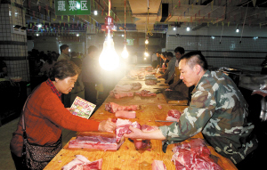 | 市民在天骄北麓生鲜超市购买猪肉。 首席记者赵伟摄 |