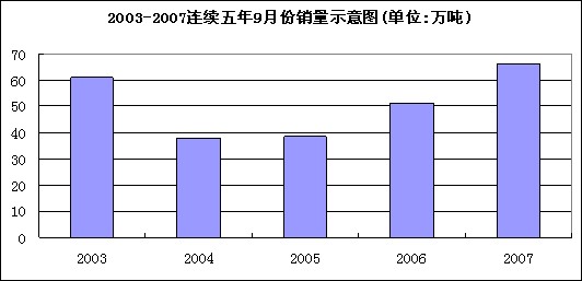 在供给量已经确定的前提下,销售量是决定商品价格走向的关键性因素,然而对最近五年来的食糖销售情况进行统计,却让我们对今年的情况感到担忧。下图展示的是2003年至2007年连续五年各年份九月份的食糖销售数据,图表显示,五年的时间里,九月份的销售峰值为2007年的66万吨,低谷为2004、2005年的38万吨,平均值为51万吨。对比五年数据来看一看本榨季截止八月末时的工业库存(230.73万吨),不寒而栗的感觉便油然而生。