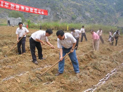 都安瑶族自治县委、县政府以实际行动贯彻落实科学发展观,在去冬今春种植7.2万亩甘蔗的基础上,今年秋季继续采取"三送一补(送种子、送地膜和基肥、送机耕,补贴息贷款)的办法,鼓励和支持群众种植秋植蔗1万亩。计划发展冬植蔗1万亩,明年春植蔗1万亩;力争到明年全县实现甘蔗种植面积达10万亩以上的目标。图为10月20日,都安县四家班子领导深入高岭镇参加秋植蔗种植义务劳动的火热场面。