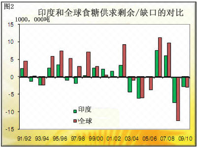 印度历来是一个意外频现的国家。谁能想到,07/08榨季产量高达2693万吨,紧接着的下一个榨季减产竟然超过1000万吨?起初大部分的预计认为08/09榨季应该在2000-2300万吨,而如今估计最多肯定也不到1700万吨,接近1550万吨的可能性极大。如图2所示,印度国内的供求与全球供求的相关性越来越高。